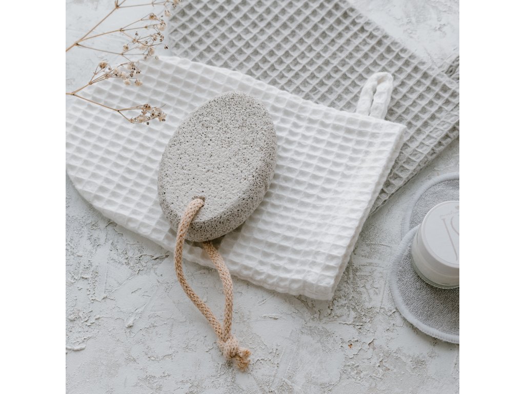 Světle šedá přírodní pemza na zjemnění pokožky s provázkem na zavěšení.